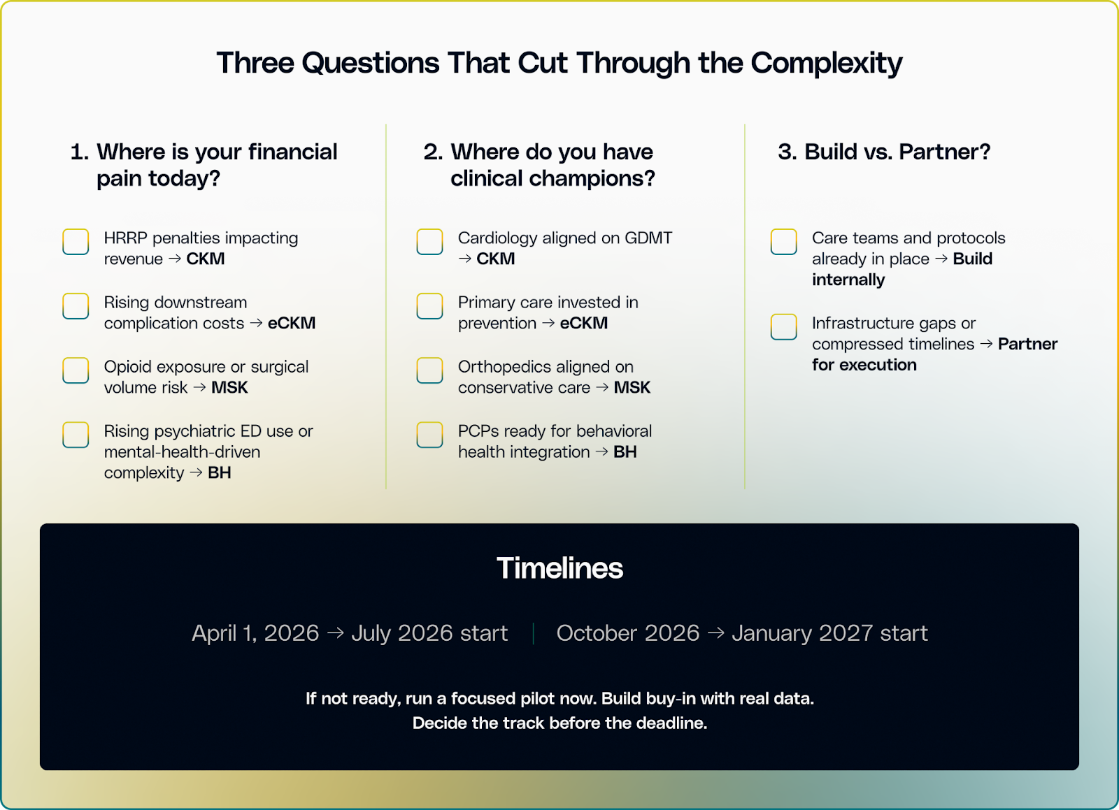 ✅Choose eCKM if your executive team has the patience to invest ahead of downstream risk and your organization can absorb prevention workflows without increasing physician burnout. Deprioritize eCKM if you are in active penalty mitigation mode and lack capacity for delayed-return programs.