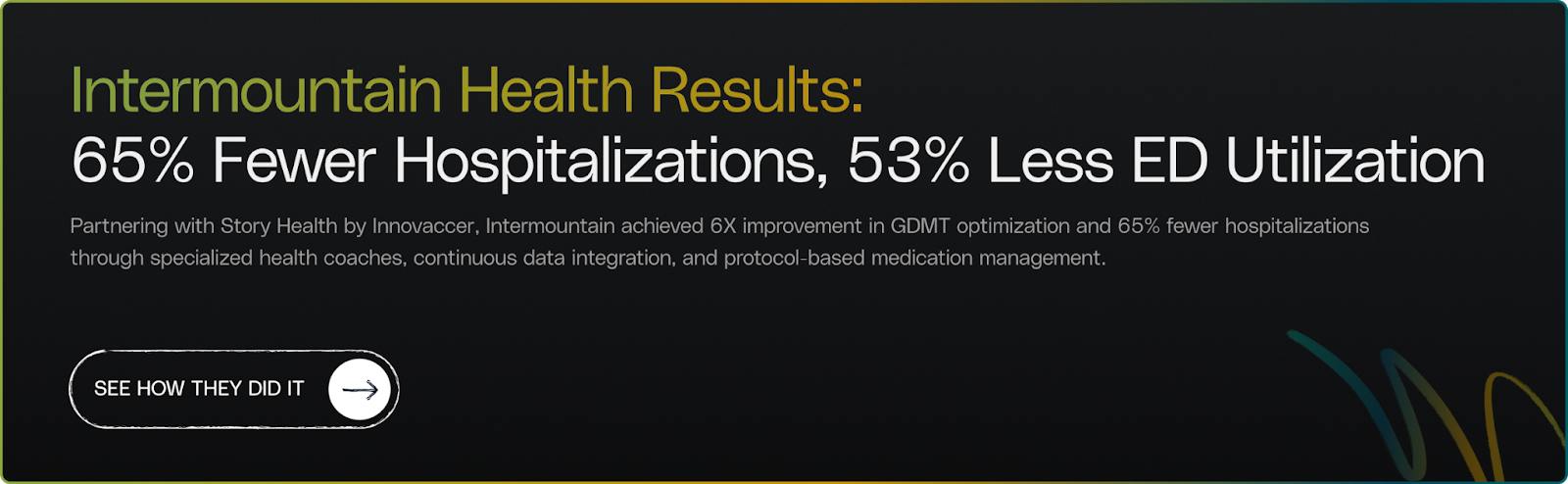 Story Health customers have demonstrated heart failure readmission reductions of 30%, measurable improvements in guideline-directed medical therapy adherence, and sustained declines in emergency department utilization. These results reflect programs where AI-powered orchestration and virtual care delivery operate as one system, expanding clinical capacity without adding headcount.